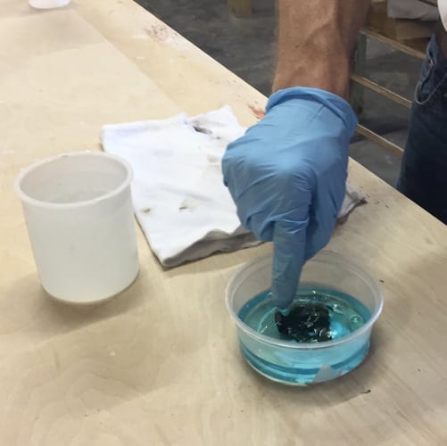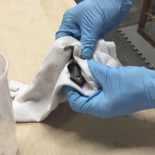 Fill one container with aging solution deep enough that the hardware will be submerged and fill the other with rinse water to the same height. You can pour the used Patinator back into the bottle when you are all done and use it over and over again, even though the liquid will have darkened.