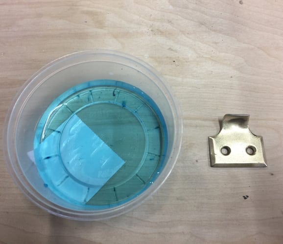 Place as much or as little hardware as you can handle into the solution and mix it around to make sure every part is coated well. Let it soak until you have reached the color you desire, and immediately remove the hardware from the aging solution and place it in the water to stop the reaction. Again, mix things around to make sure all sides are cleaned.