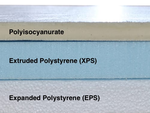 Polyisocyanurate (polyiso for short) has the highest R-value and (no surprise) correspondingly the highest cost for any rigid insulation. Its R-value does have a tendency to degrade over time with exposure. Typically sold with a radiant barrier of foil on both sides, you also get the benefit of stopping radiant heat with this foam. Read about radiant heat transfer here! Polyiso is essentially the board form of the closed-cell spray we talked about in the first section.